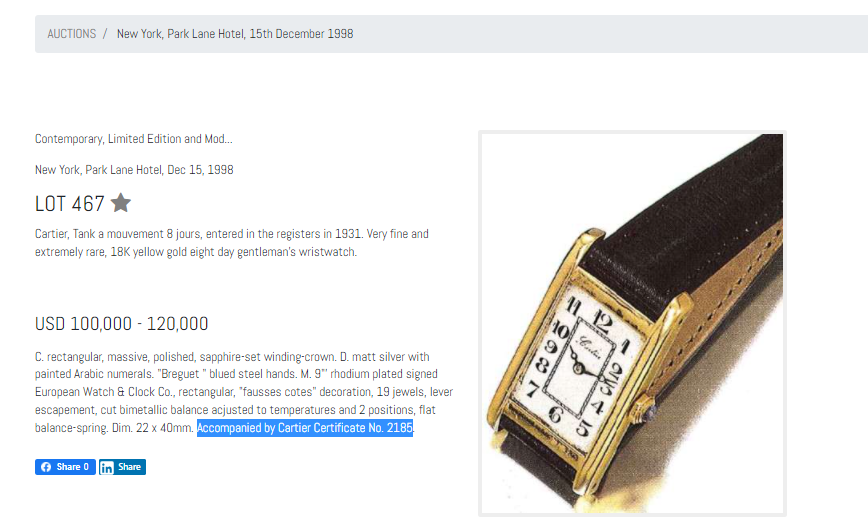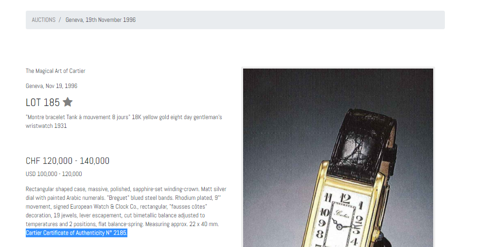 4: “Remarkably, only two other 8-day Cartier Tanks have been seen at auction. The first sold in 1989 and again in 1996 while Christie's sold the second in 2006 for 138,000 CHF and again in 2009 for 99,000 CHF.” Christie’s December, 2015