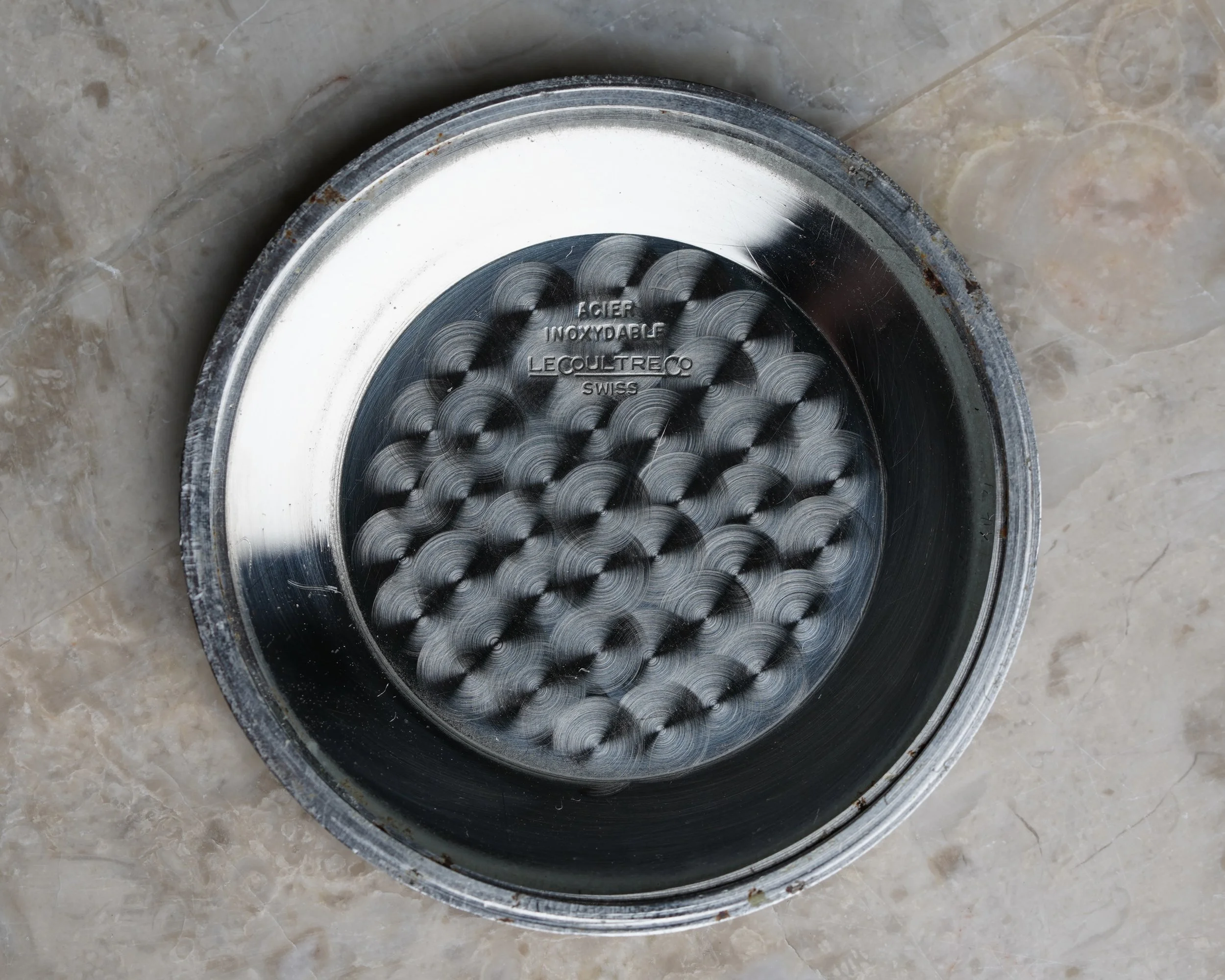 On the exterior of the case back, a serial number (or case number) is present. For this period, reference number are absent from the cases back. Instead, it features “ACIER INOXYDABLE” (Stainless Steel) and “LECOULTRE CO SWISS”. The interior of the steel case is decorated with a beautiful perlage which is a nice touch. The technique was originally incorporated for catching any dust or materials that could potentially hinder the performance of the movement, however, at this point the practice is more about beautification and tradition.