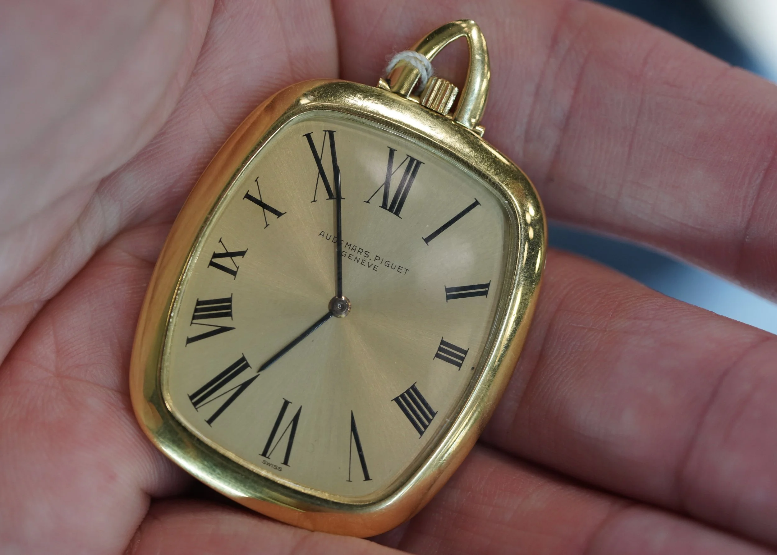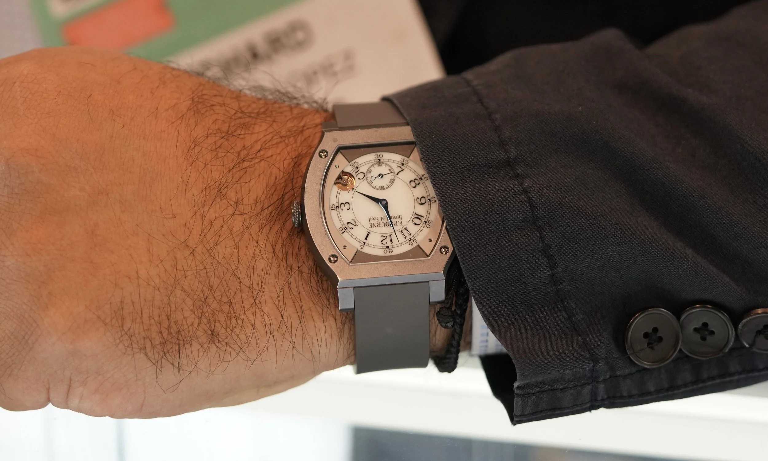Casually walking through the aisles was an Italian dealer, Fabrizio Caso (@casowatches), wearing khaki shorts and a long sleeve shirt which concealed timepieces on both wrists. Throughout the day, he would frequently change the watches he was wearing (a trend I might copy at the next watch fair). Each time we would cross paths, I stopped Caso demanding to know what his latest timepiece was. A standout was the mammoth-sized Piaget with stepped case and a fascinating bracelet. “I just picked this up” he replied as he rolled up his sleeve for a photo.