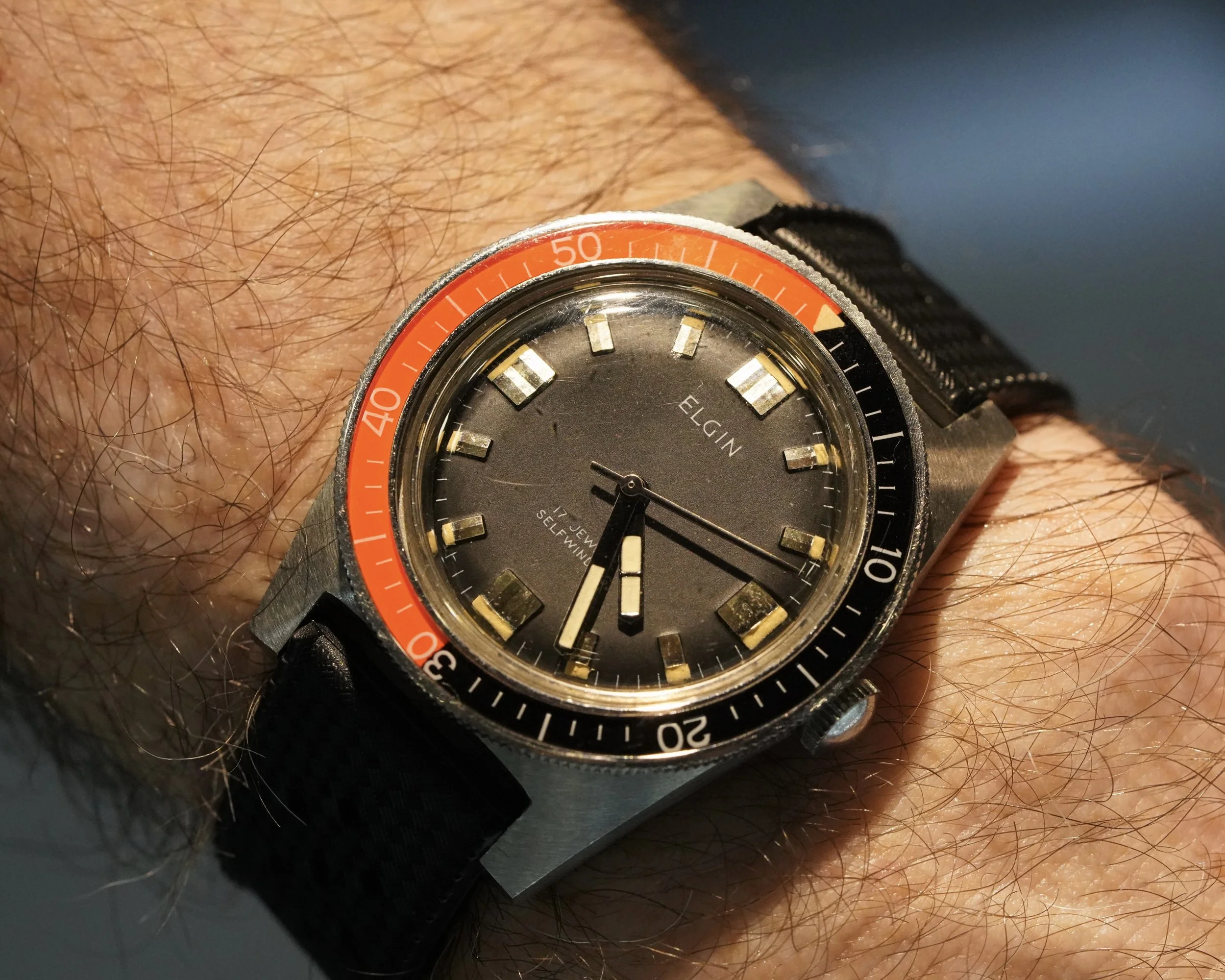 “I wanted a simple, classic diver, and this Elgin 4156 checked a lot of boxes for me: a reasonable 37mm, no date, stick and block indices, and overall subtlety (despite the pop of the bright orange in the bezel!). When I saw a variant of this model with day/date, Arabic numerals at 6-9-12, and a red seconds hand, I came to appreciate the simplicity and symmetry of this one even more.”