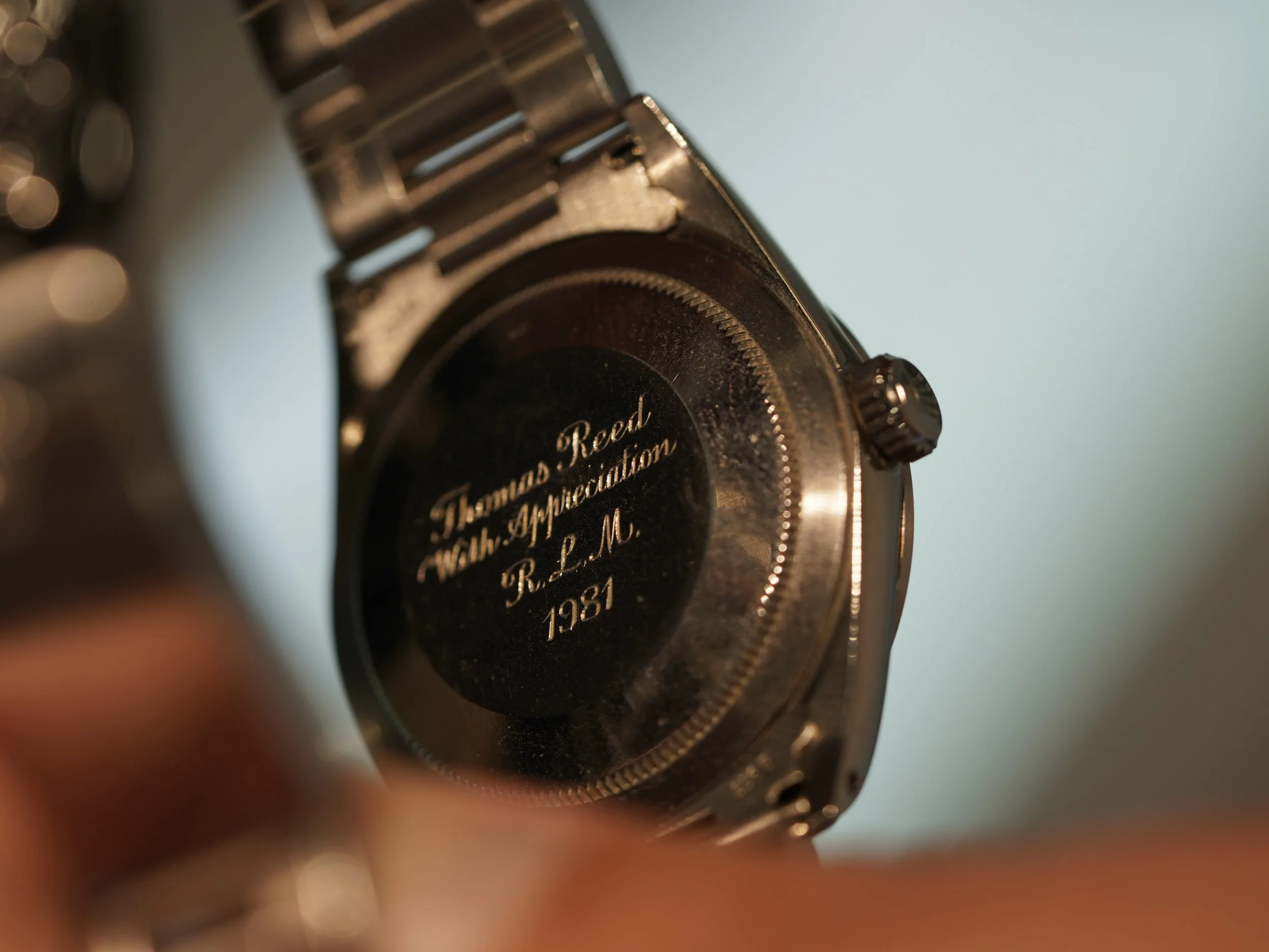 Staying on the Tiffany train, Eric Wind wore his latest offering throughout most of the show (perhaps to get a bit of enjoyment out of it before stomaching its inevitable departure to a new home). The watch - a Rolex Explorer reference 1016 retailed by Tiffany & Co. While Wind’s Tiffany Rolex didn’t come with a box, it did come with a case back engraving.