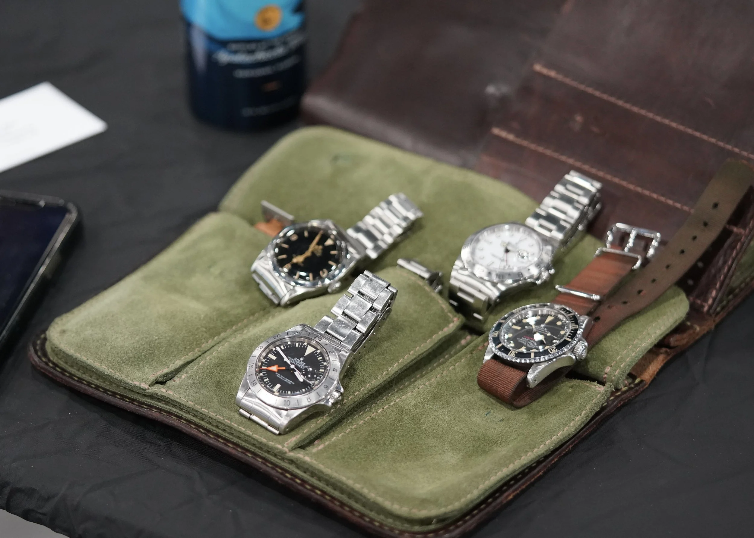 Being obsessed with presentation boxes and other ephemera, another eye-catching Rolex in the Menta booth was a Submariner 16613. I looked over at Adam Golden and asked if I could see his Rolex. Sitting comfortably on the couch, he reminded me I was sharing the booth with him and I was welcome to take the watch out myself. Having a good laugh at this, he elaborated on the double-signed Tiffany Sub.