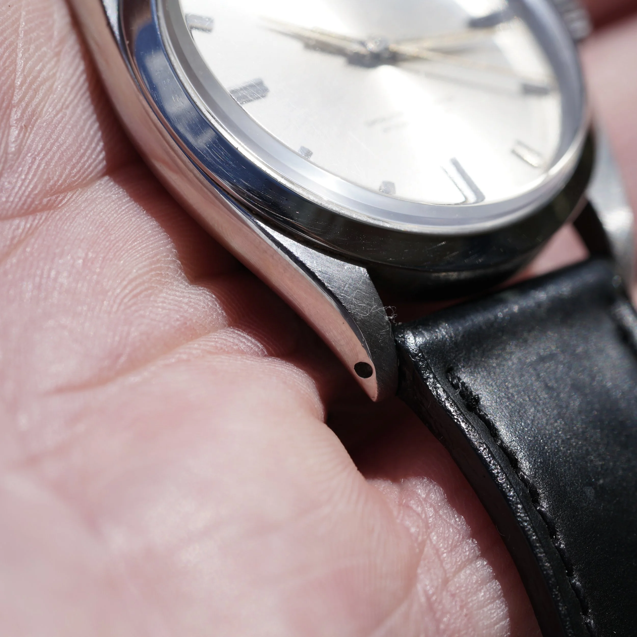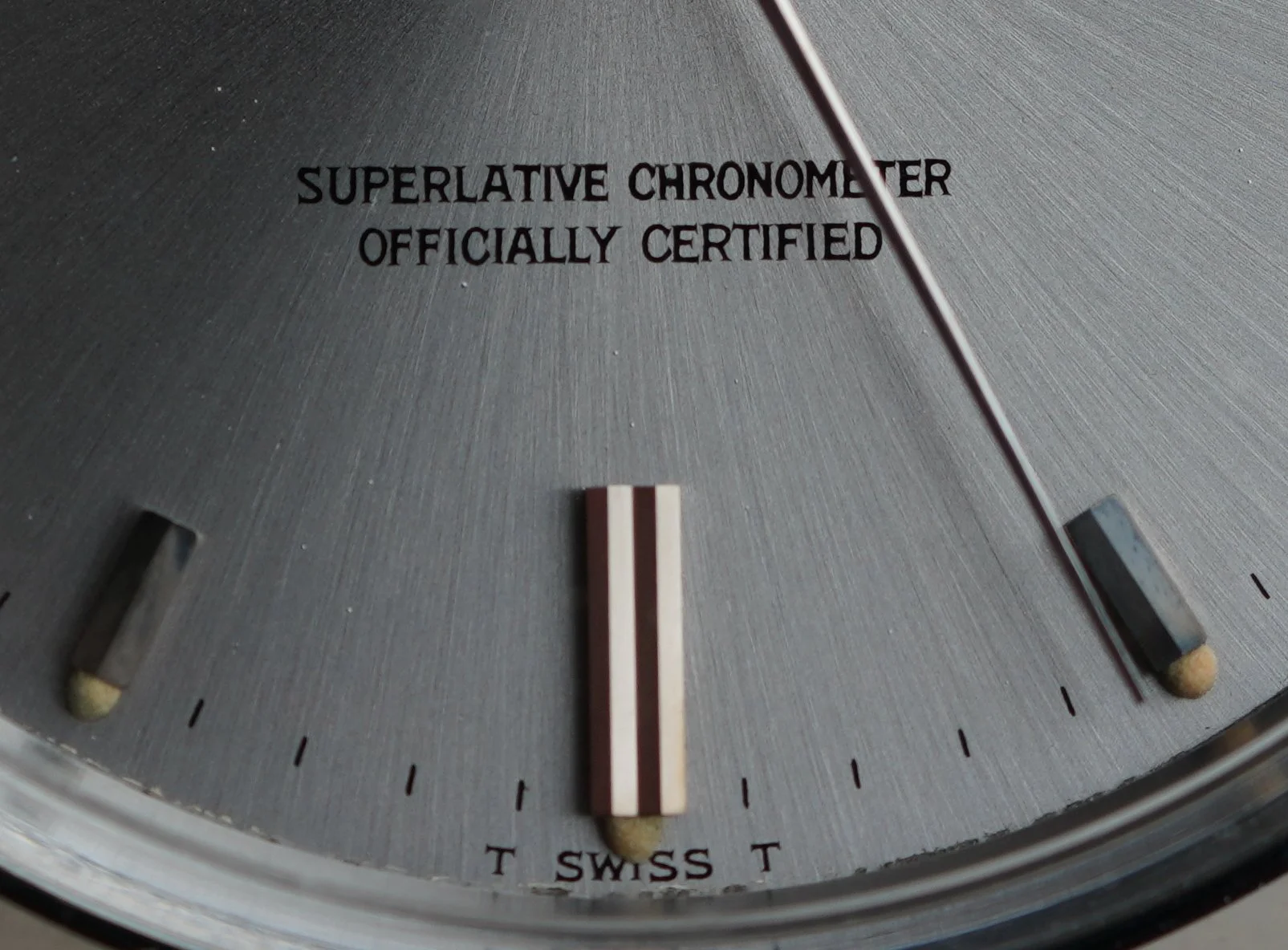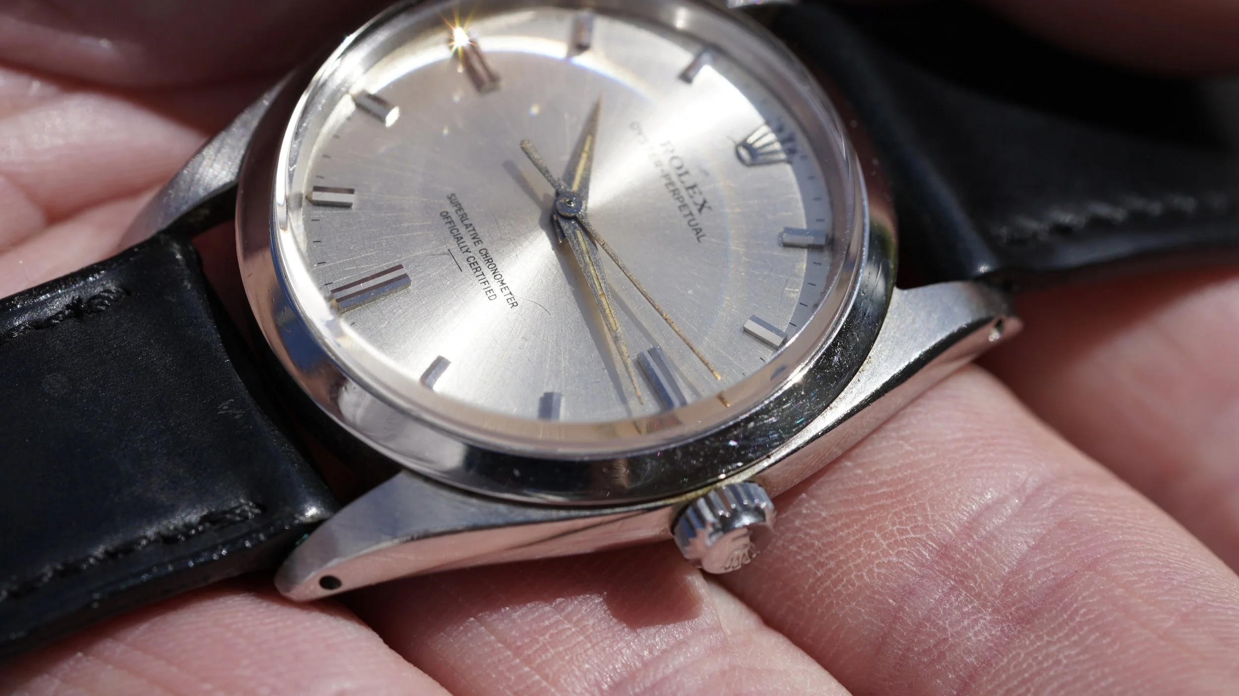The present example features a salient soleil finish in which pale lines appear to be bleeding through the surface. Again, the early models features a “SWISS” only dial. Some lume plots in the upper hemisphere have been compromised, however this should not have as much of a detrimental effect on value as in instances of Rolex sports models. There is a small scratch below the applied coronet. Looking very closely at the “Rolex” font, extremely small circles of paint have faded off showing the grey-dial surface through the branding. The dauphine hands have taken on a lot of character from the lume resulting in a very attractive pale yellow in natural light.