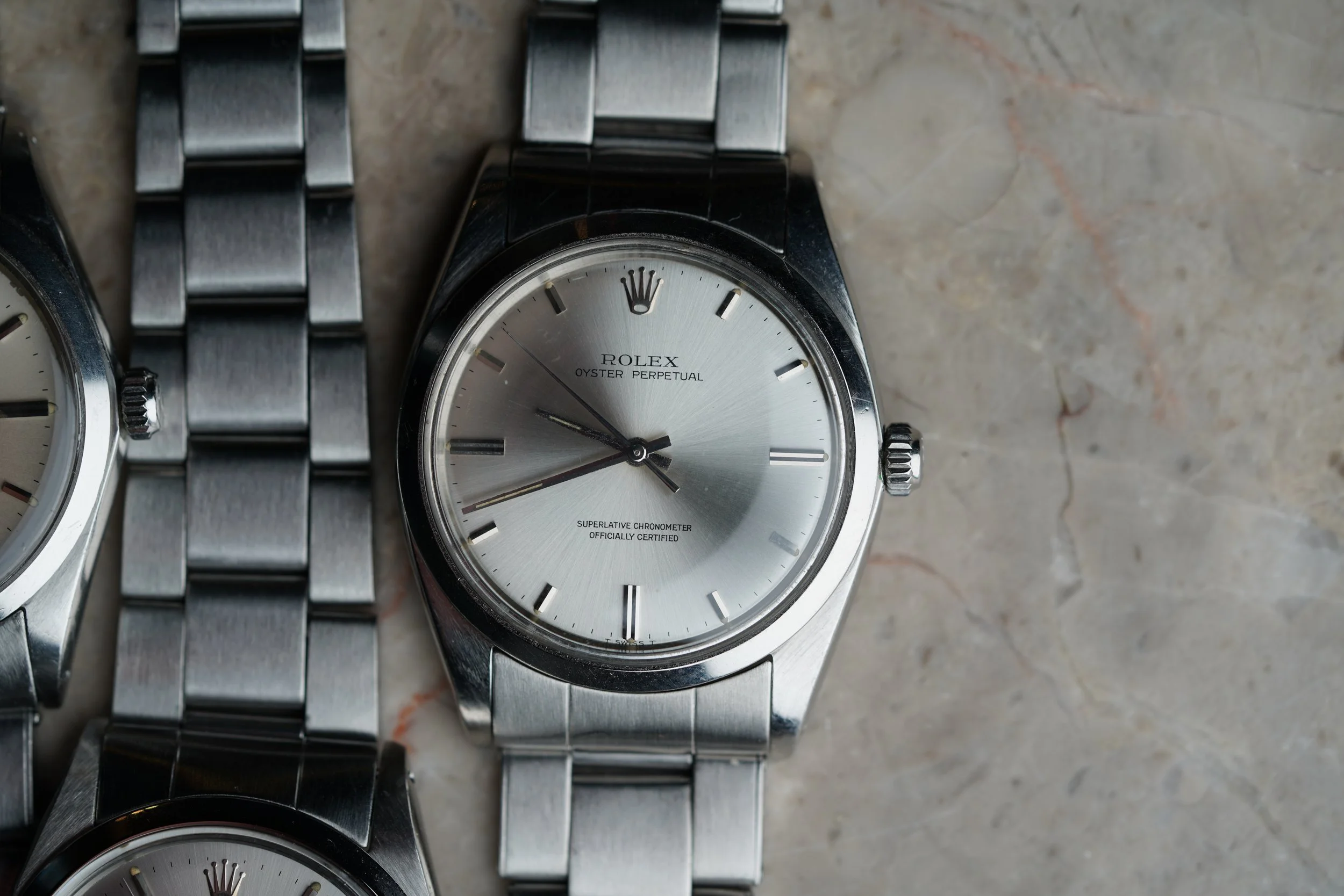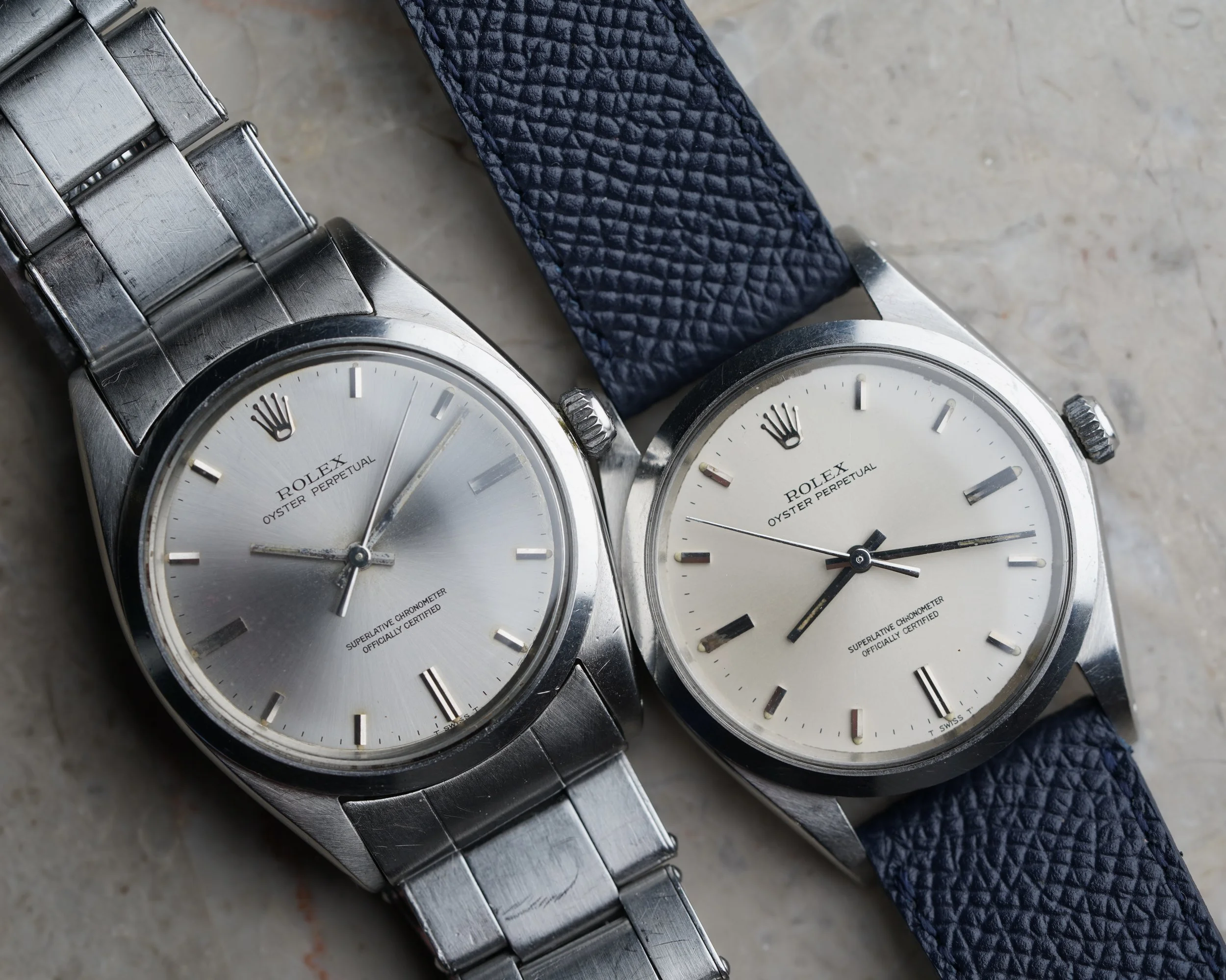 An unpolished 34mm Rolex Oyster Perpetual reference 1002 (left) and 36mm reference 1018 (right). Note: The soleil finish is extremely faint on the 1018s with “milky-silver” dials.
