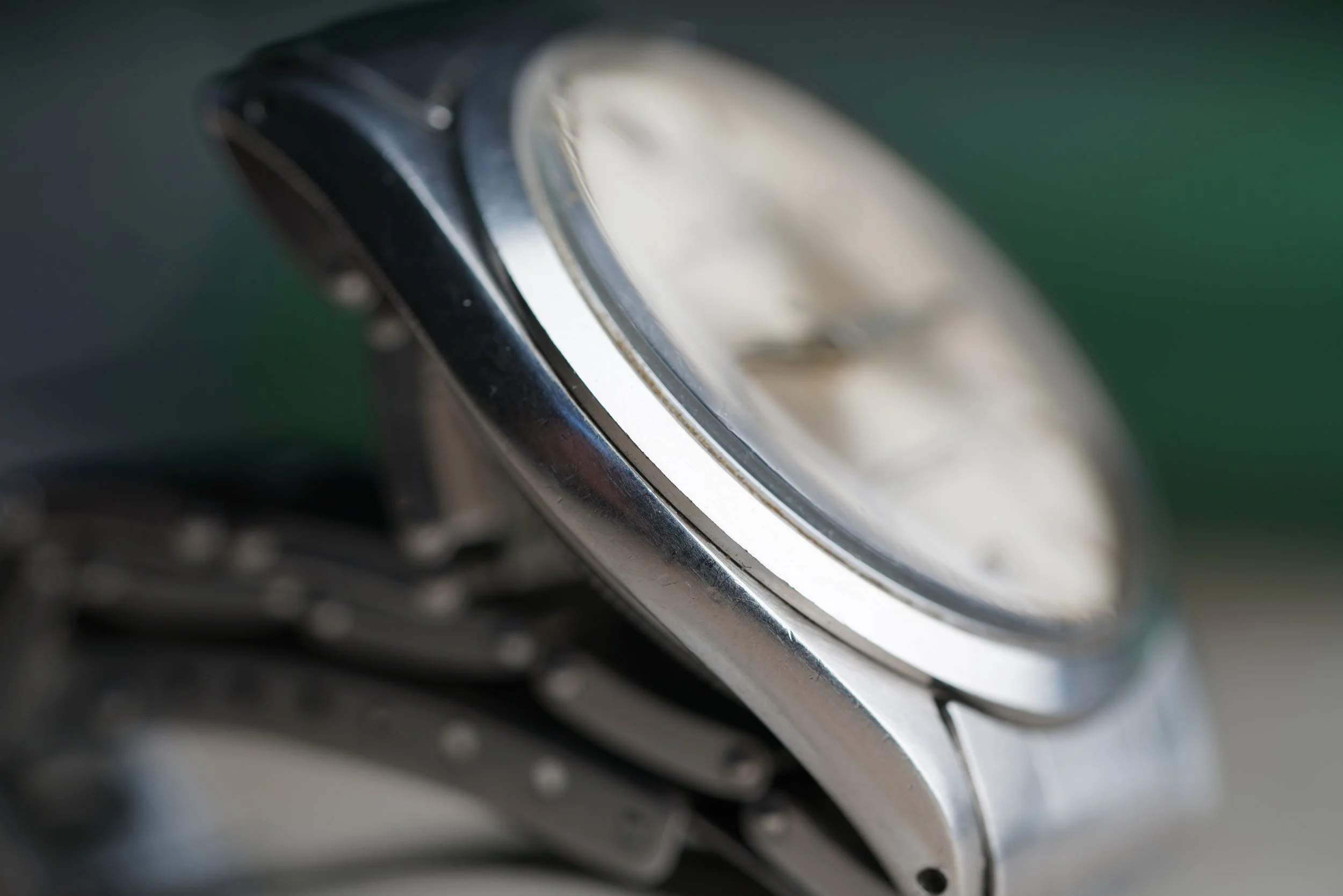 The youngest of the five models features a 2.12M serial dating to circa 1969. The case is unpolished and features a milky-silver dial. These dials were produced by the specialist Beyeler & Cie (which Rolex would fully acquire the manufacturer in the year 2000). It is a much more faint soleil dial, almost to the point of not being discernible. The watch is paired on a non-stretch 7206 Swiss Oyster rivet bracelet with 58 end links.